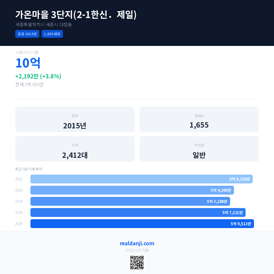 가온마을 3단지(2-1한신.제일) 국민평형 기준 2026년 평균 거래가는 5억 9,513만으로, 전년 대비 3.8% 상승 했습니다.