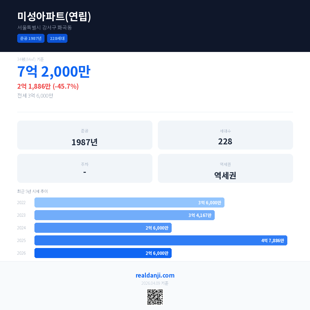 미성아파트(연립) 국민평형 기준 2026년 평균 거래가는 2억 6,000만으로, 전년 대비 45.7% 하락 했습니다.