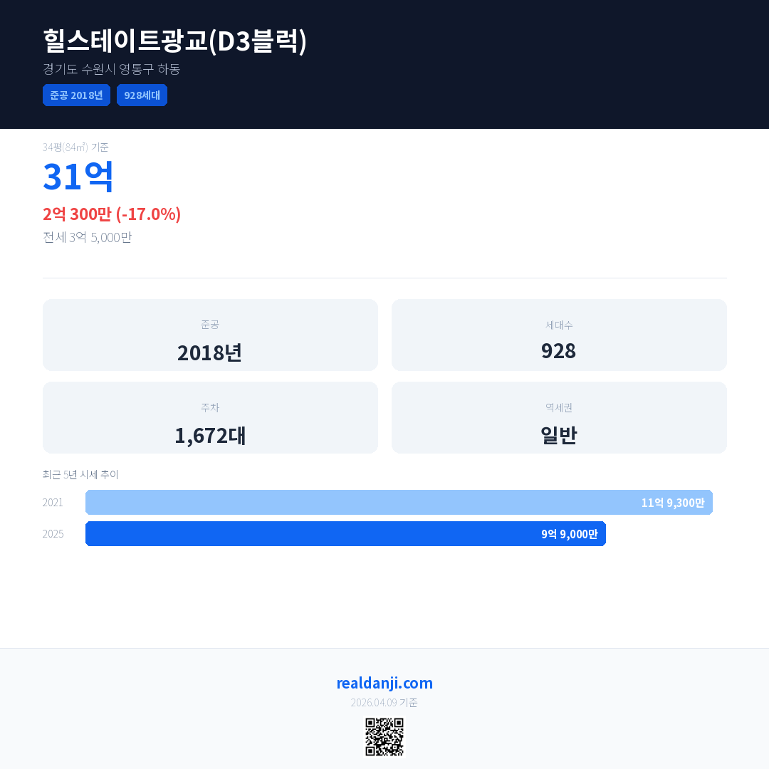 힐스테이트광교(D3블럭) 최근 거래가는 31억입니다. (2026-03)