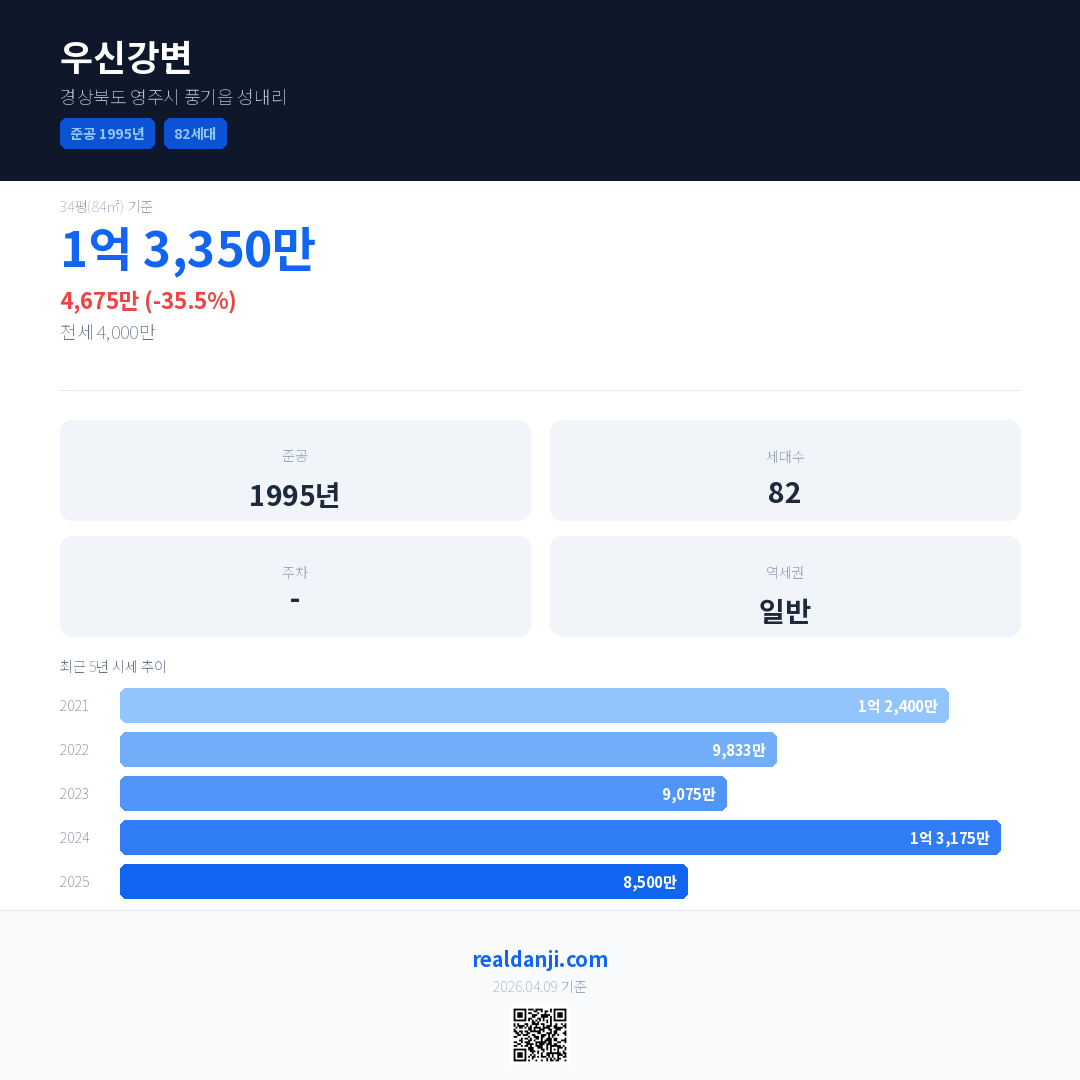 우신강변 국민평형 기준 2025년 평균 거래가는 8,500만으로, 전년 대비 35.5% 하락 했습니다.