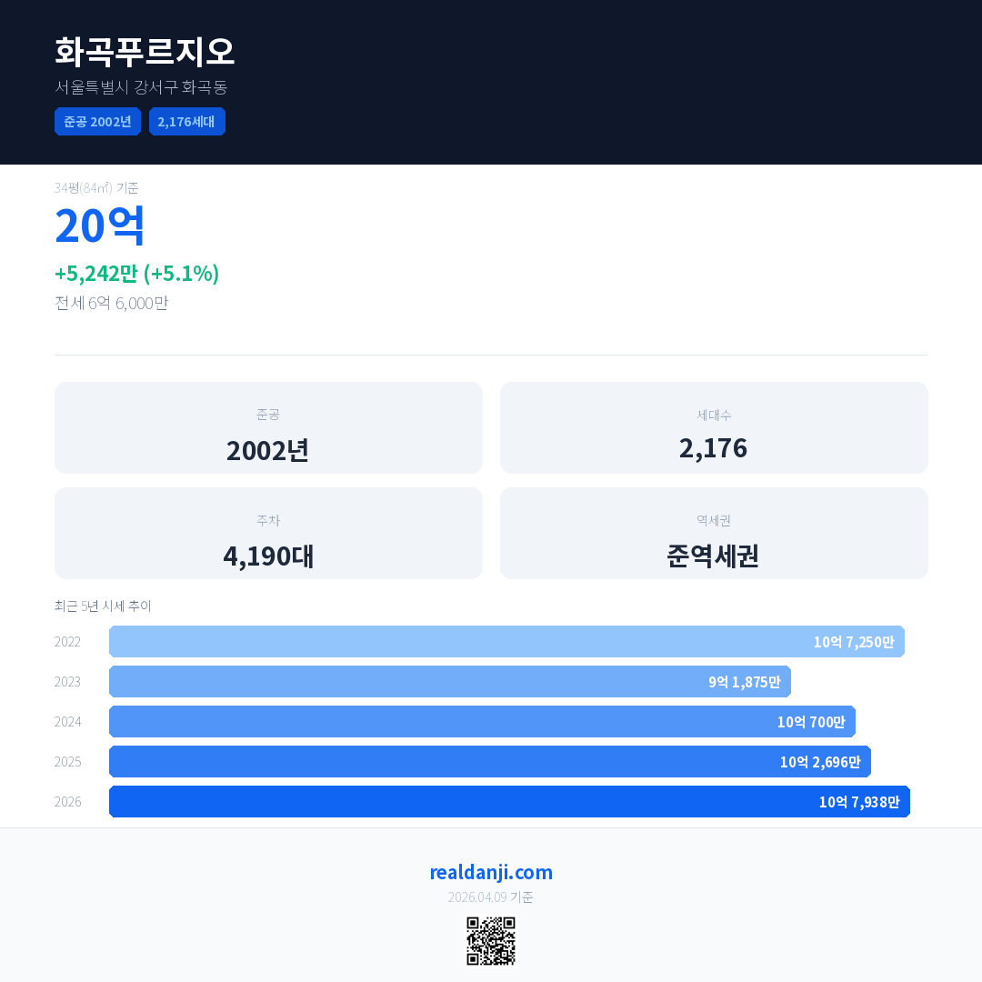 화곡푸르지오 국민평형 기준 2026년 평균 거래가는 10억 7,938만으로, 전년 대비 5.1% 상승 했습니다.