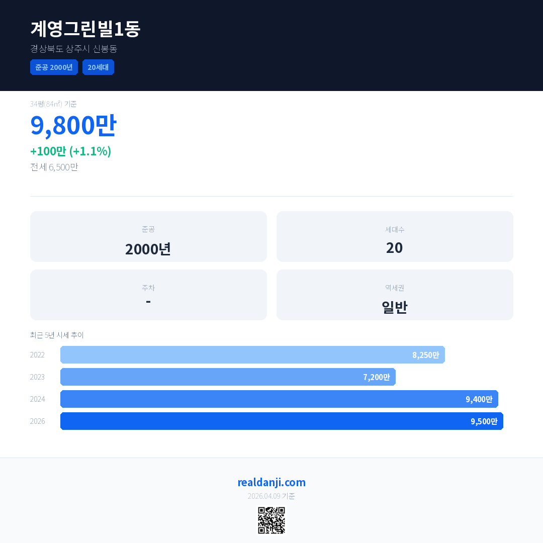 계영그린빌1동 국민평형 기준 2026년 평균 거래가는 9,500만으로, 전년 대비 1.1% 상승 했습니다.