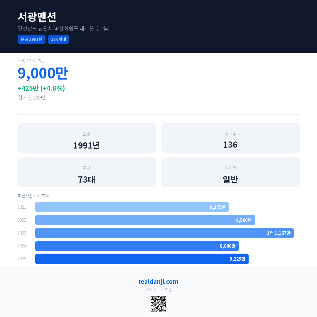 서광맨션 국민평형 기준 2025년 평균 거래가는 9,225만으로, 전년 대비 4.8% 상승 했습니다.