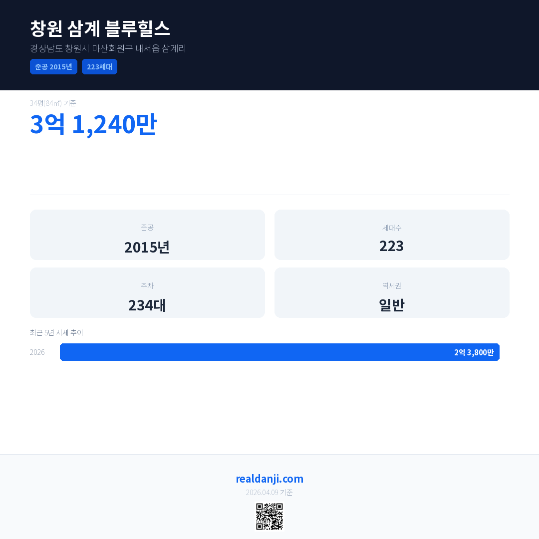 창원 삼계 블루힐스 최근 거래가는 3억 1,240만입니다. (2026-03)