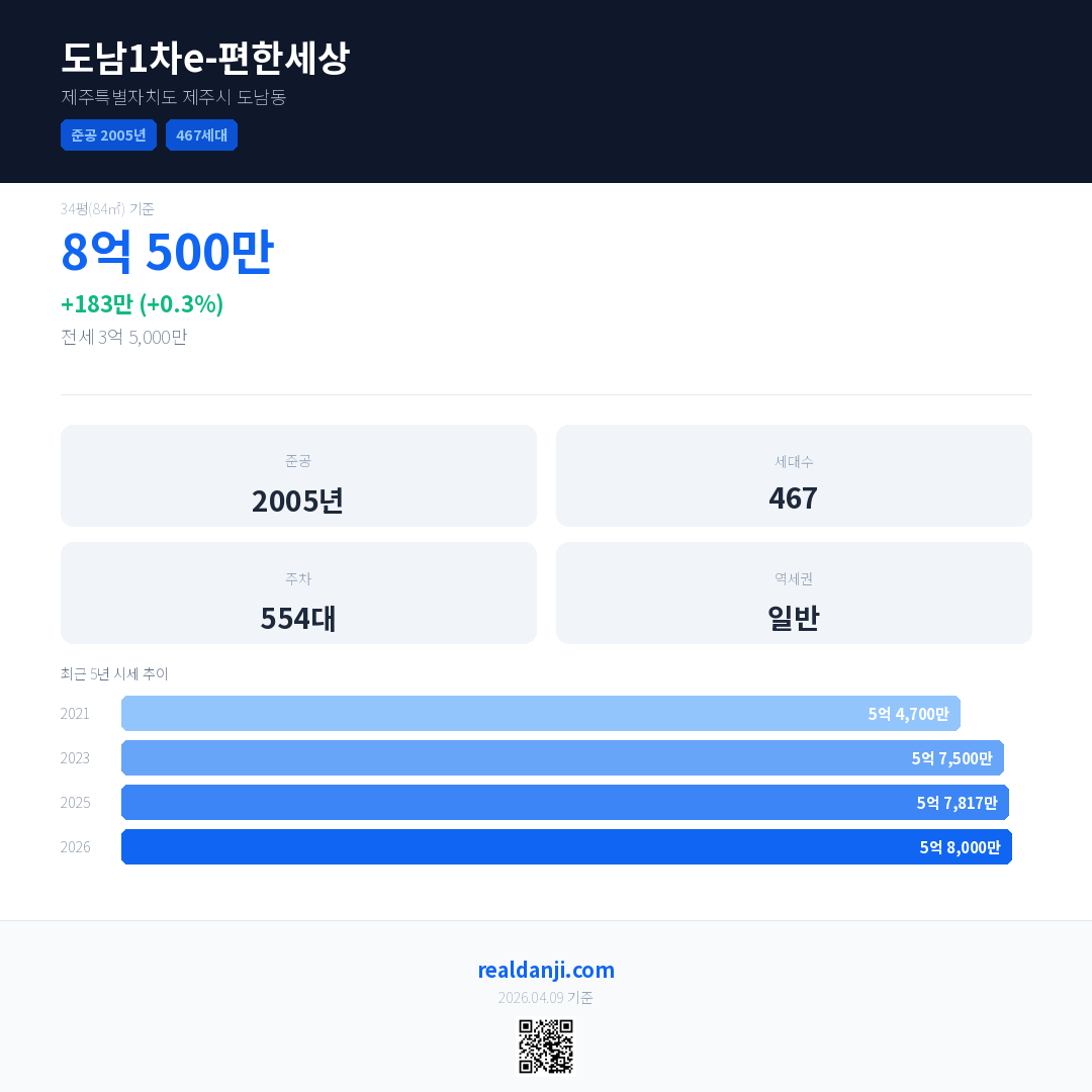 도남1차e-편한세상 국민평형 기준 2026년 평균 거래가는 5억 8,000만으로, 전년 대비 0.3% 상승 했습니다.