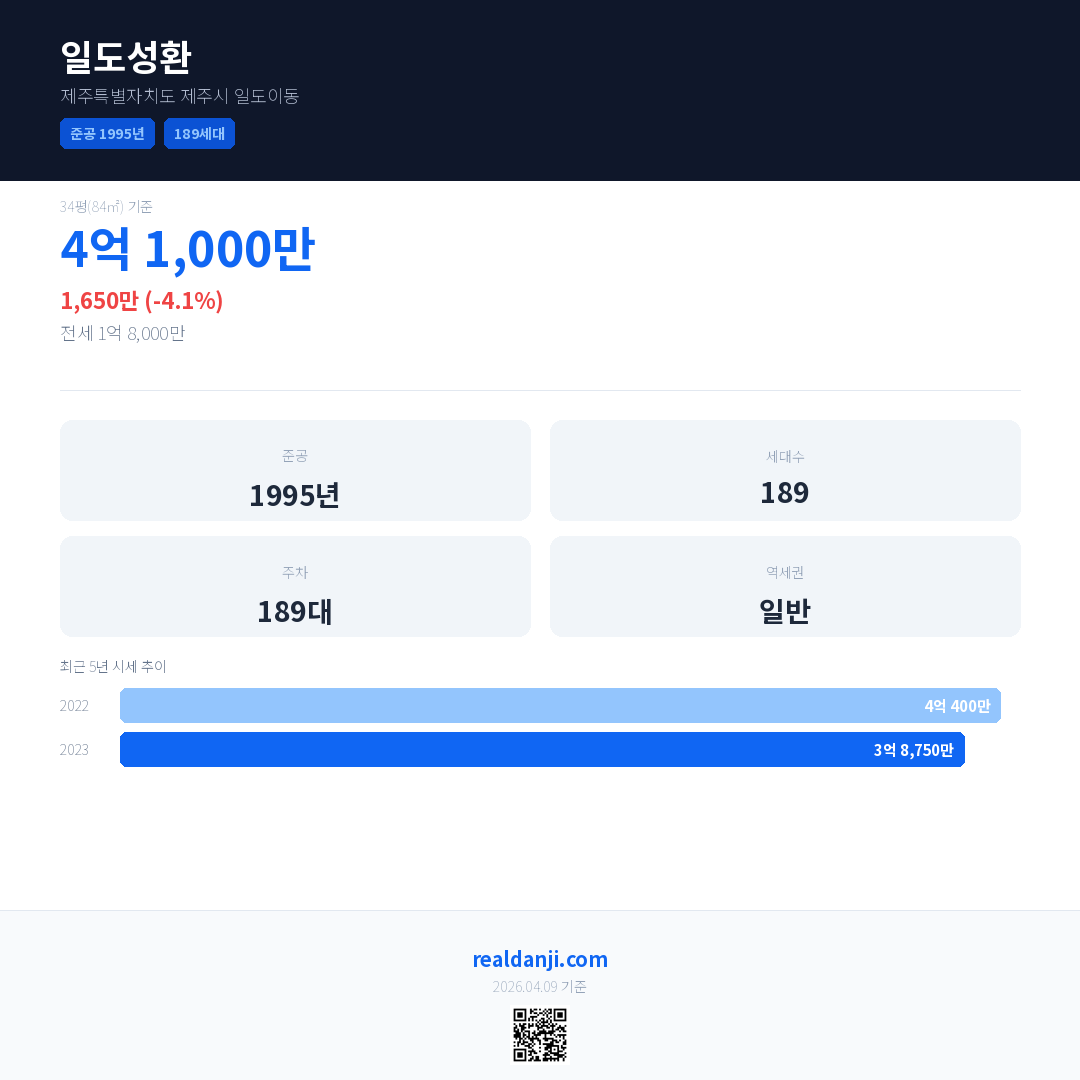 일도성환 국민평형 기준 2023년 평균 거래가는 3억 8,750만으로, 전년 대비 4.1% 하락 했습니다.