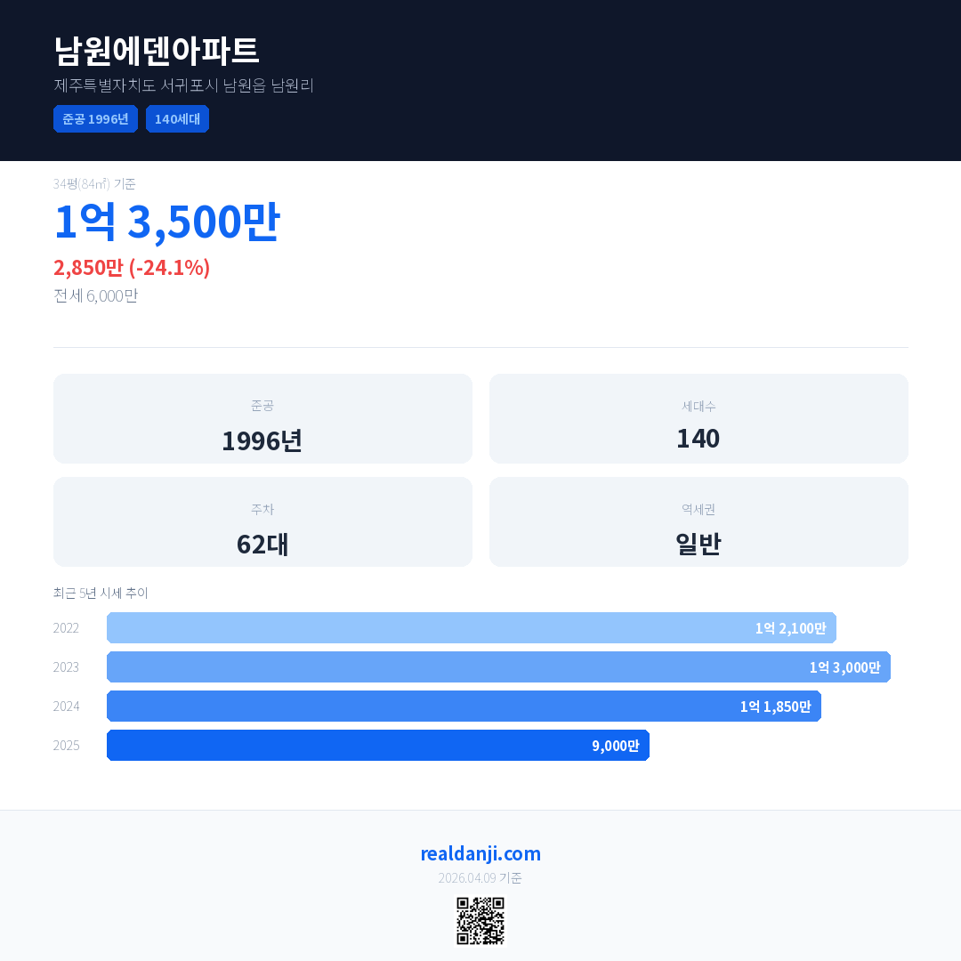 남원에덴아파트 국민평형 기준 2025년 평균 거래가는 9,000만으로, 전년 대비 24.1% 하락 했습니다.
