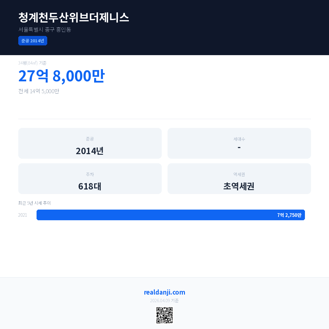 청계천두산위브더제니스은(는) 2014년에 준공되었으며, 현재 12년차입니다.