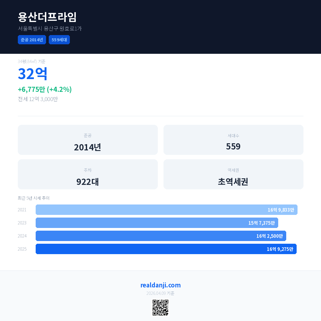 용산더프라임 국민평형 기준 2025년 평균 거래가는 16억 9,275만으로, 전년 대비 4.2% 상승 했습니다.