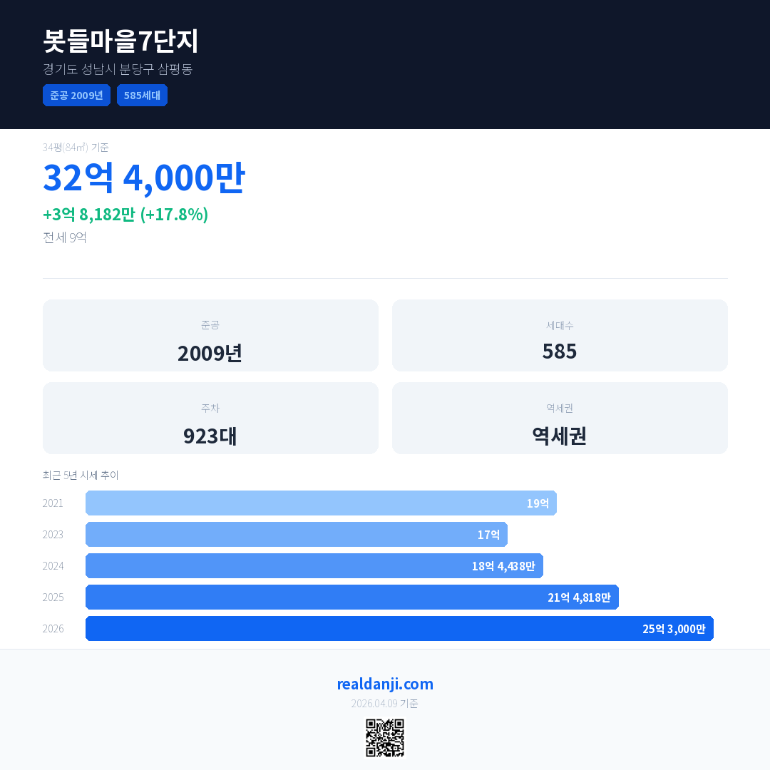 봇들마을7단지 국민평형 기준 2026년 평균 거래가는 25억 3,000만으로, 전년 대비 17.8% 상승 했습니다.