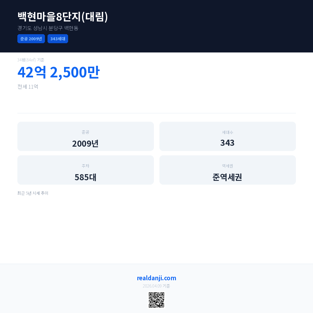 백현마을8단지(대림) 최근 거래가는 42억 2,500만입니다. (2026-02)