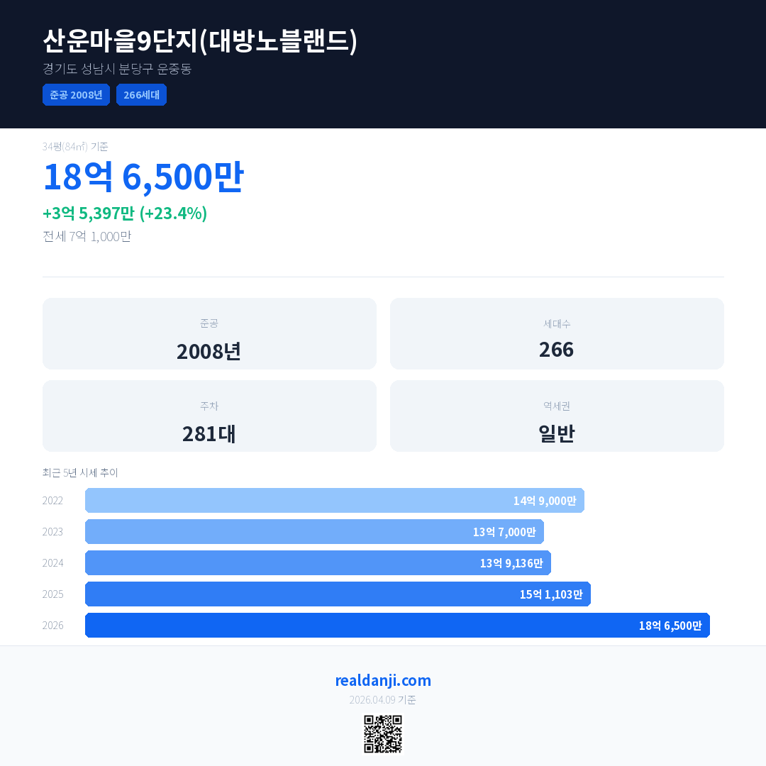 산운마을9단지(대방노블랜드) 국민평형 기준 2026년 평균 거래가는 18억 6,500만으로, 전년 대비 23.4% 상승 했습니다.