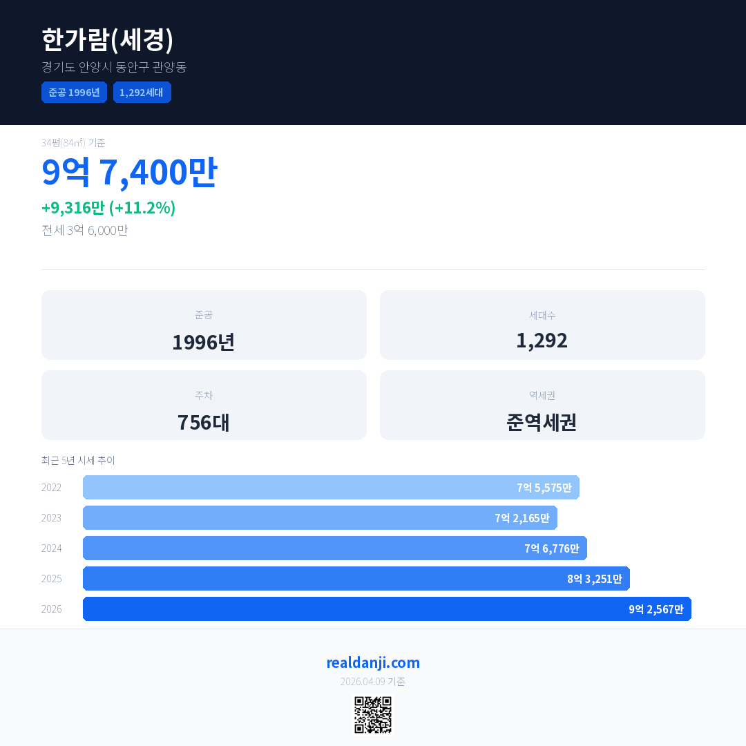한가람(세경) 국민평형 기준 2026년 평균 거래가는 9억 2,567만으로, 전년 대비 11.2% 상승 했습니다.
