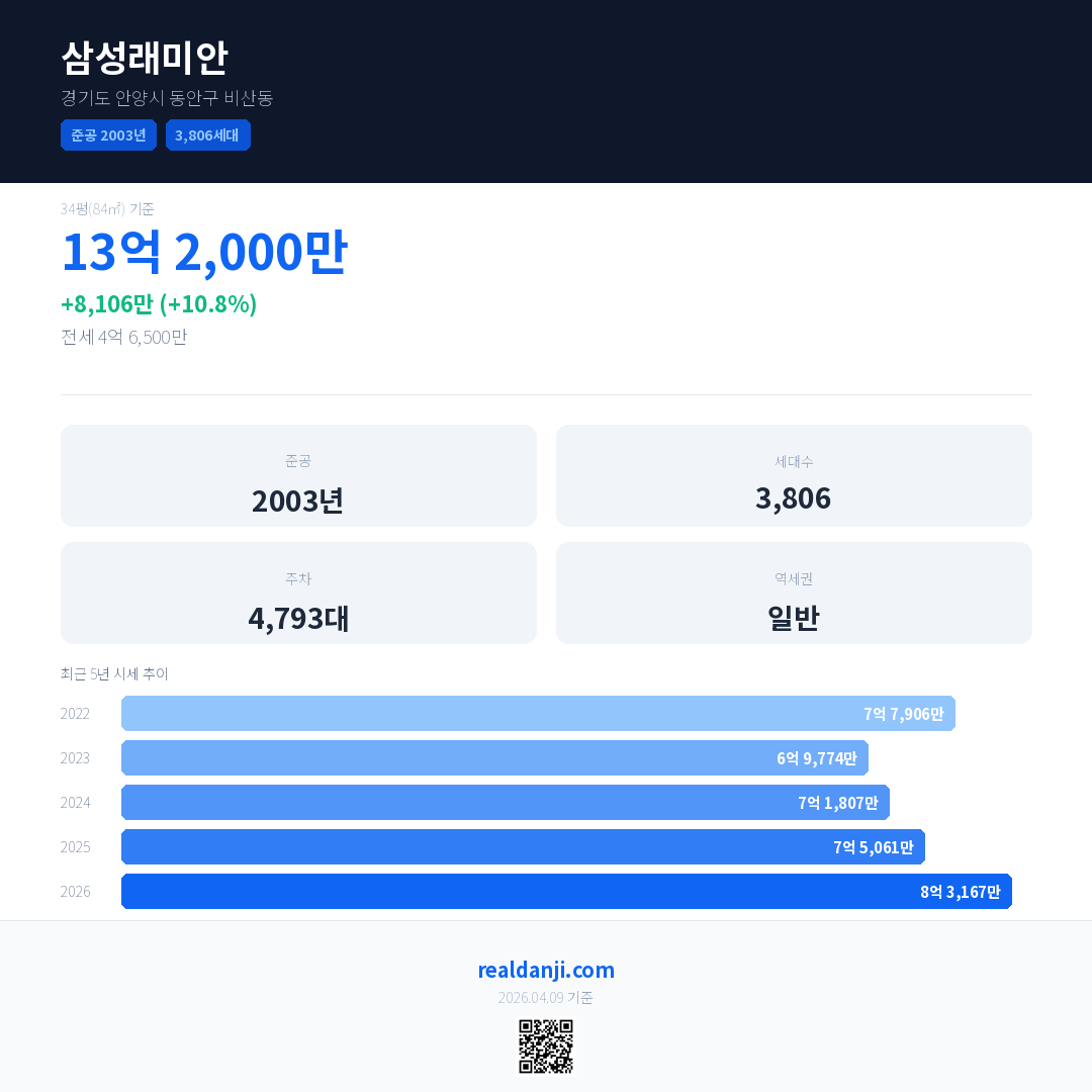 삼성래미안 최근 거래가는 13억 2,000만입니다. (2026-03)