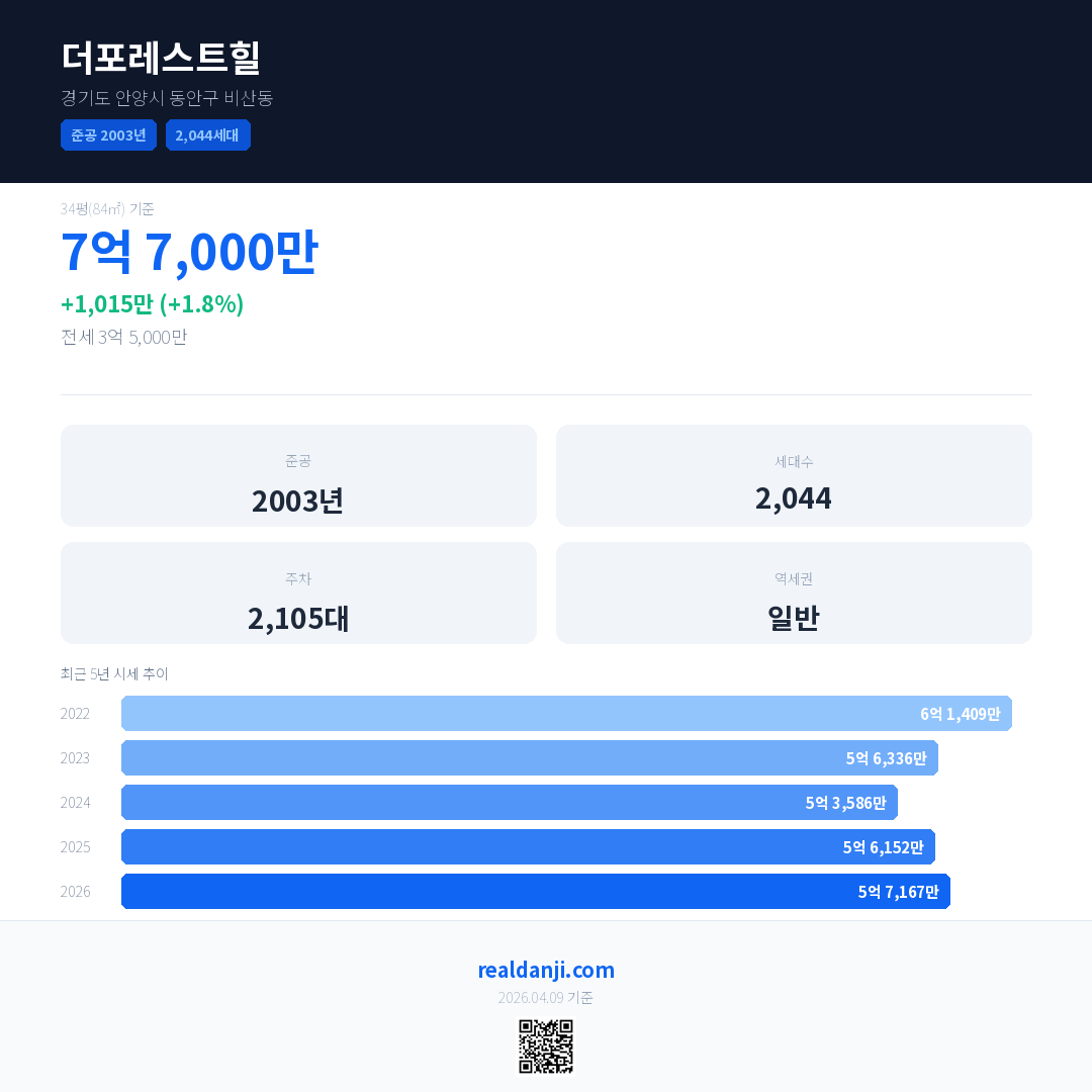 더포레스트힐 국민평형 기준 2026년 평균 거래가는 5억 7,167만으로, 전년 대비 1.8% 상승 했습니다.