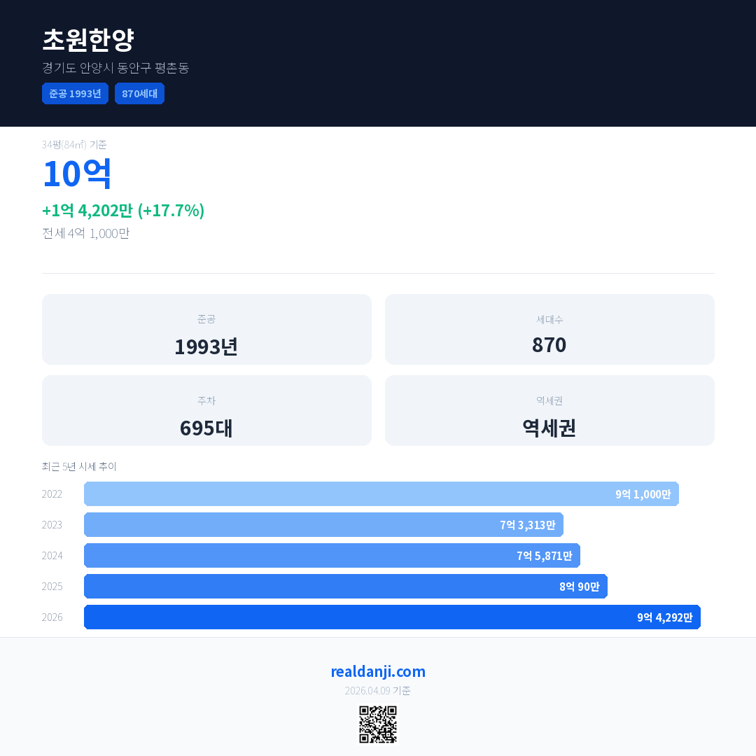 초원한양 국민평형 기준 2026년 평균 거래가는 9억 4,292만으로, 전년 대비 17.7% 상승 했습니다.