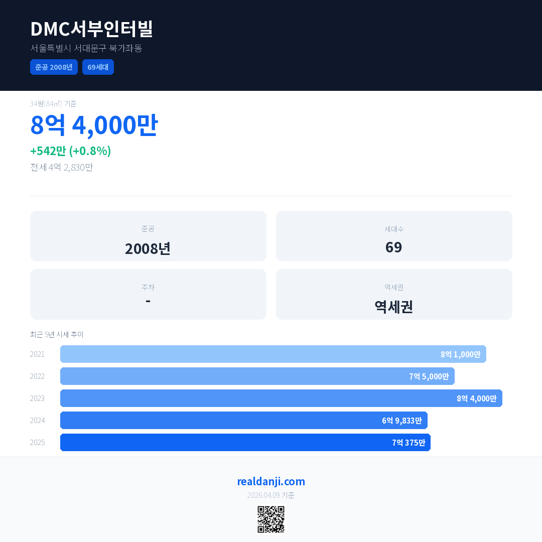 DMC서부인터빌 최근 거래가는 8억 4,000만입니다. (2025-10)