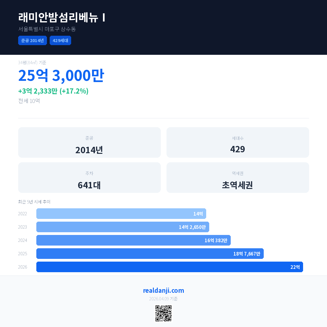 래미안밤섬리베뉴Ⅰ 최근 거래가는 25억 3,000만입니다. (2026-02)