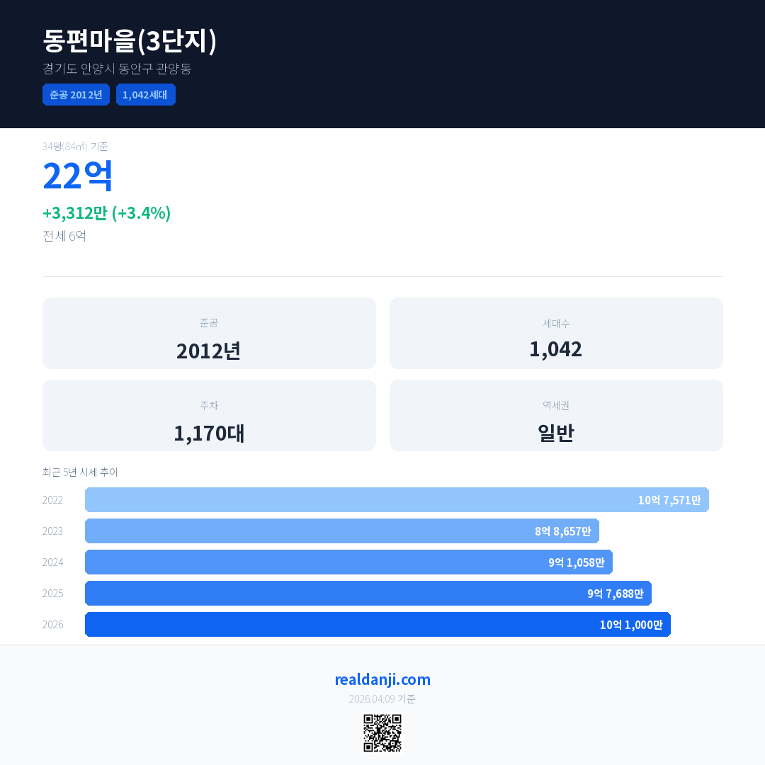 동편마을(3단지) 최근 거래가는 22억입니다. (2026-03)