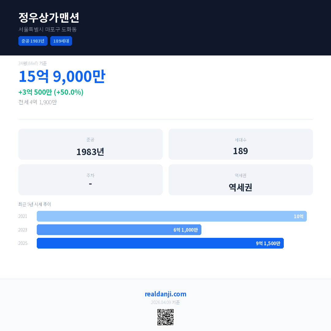 정우상가맨션 국민평형 기준 2025년 평균 거래가는 9억 1,500만으로, 전년 대비 50.0% 상승 했습니다.