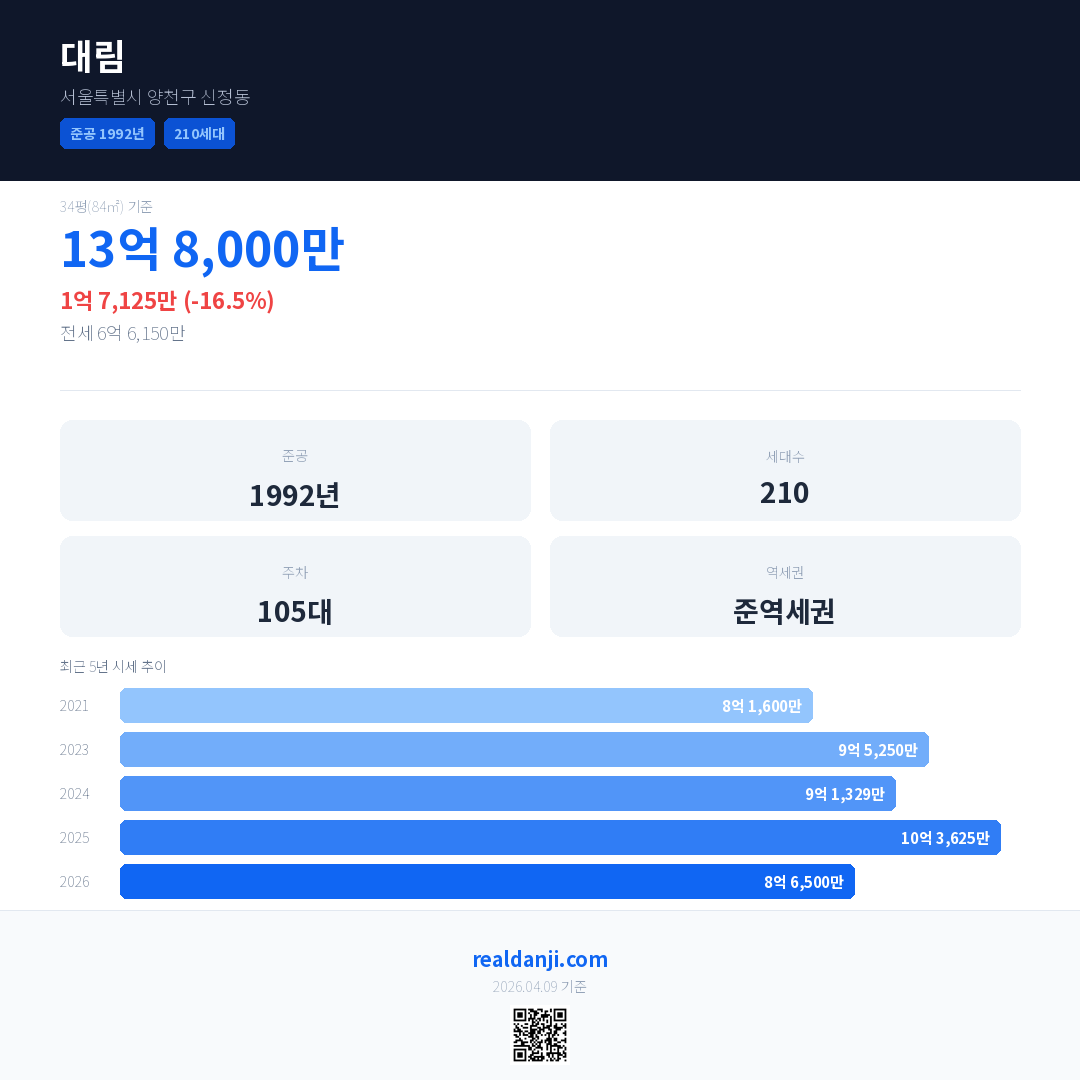 대림 국민평형 기준 2026년 평균 거래가는 8억 6,500만으로, 전년 대비 16.5% 하락 했습니다.