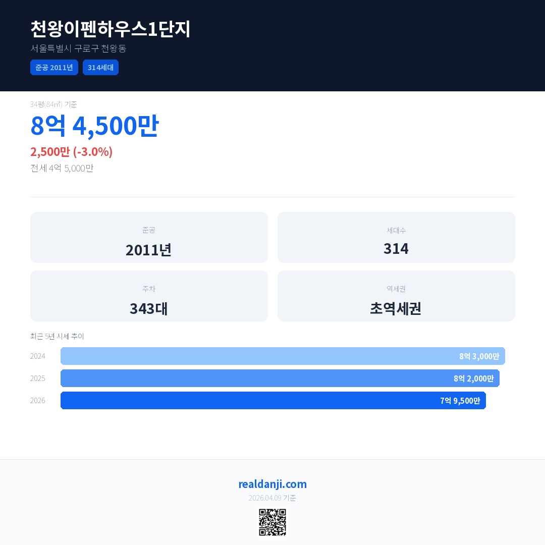 천왕이펜하우스1단지 국민평형 기준 2026년 평균 거래가는 7억 9,500만으로, 전년 대비 3.0% 하락 했습니다.