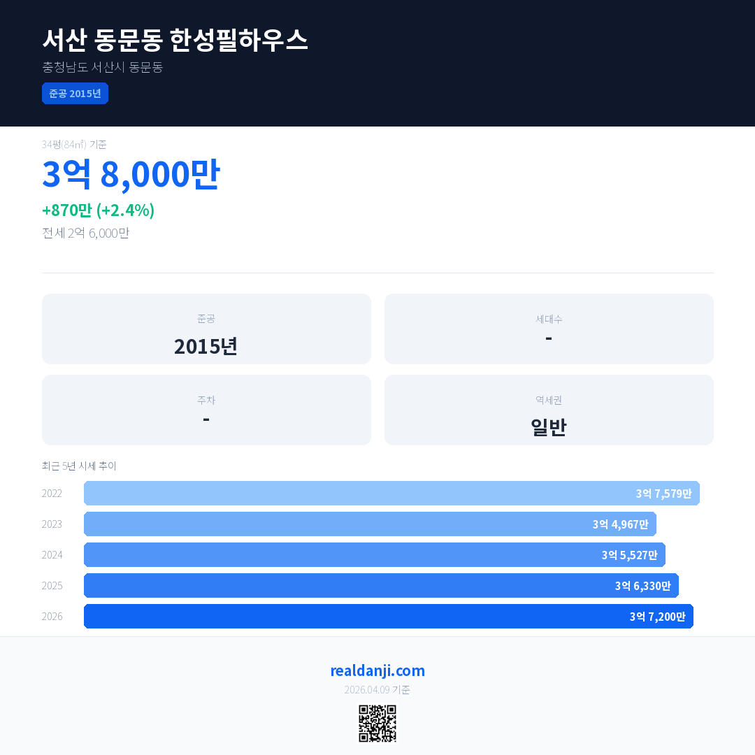 서산 동문동 한성필하우스 최근 거래가는 3억 8,000만입니다. (2026-03)