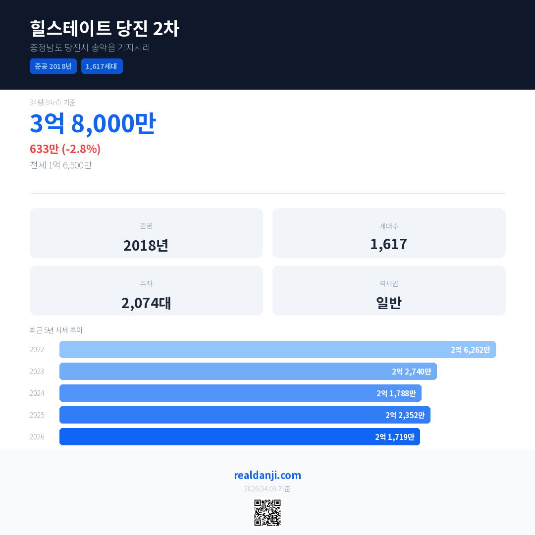 힐스테이트 당진 2차 국민평형 기준 2026년 평균 거래가는 2억 1,719만으로, 전년 대비 2.8% 하락 했습니다.
