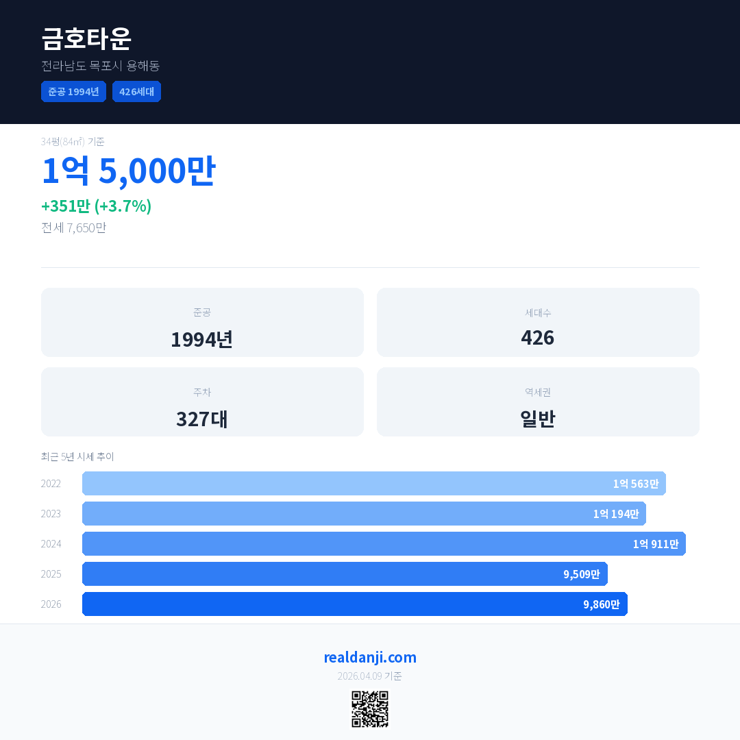 금호타운 국민평형 기준 2026년 평균 거래가는 9,860만으로, 전년 대비 3.7% 상승 했습니다.