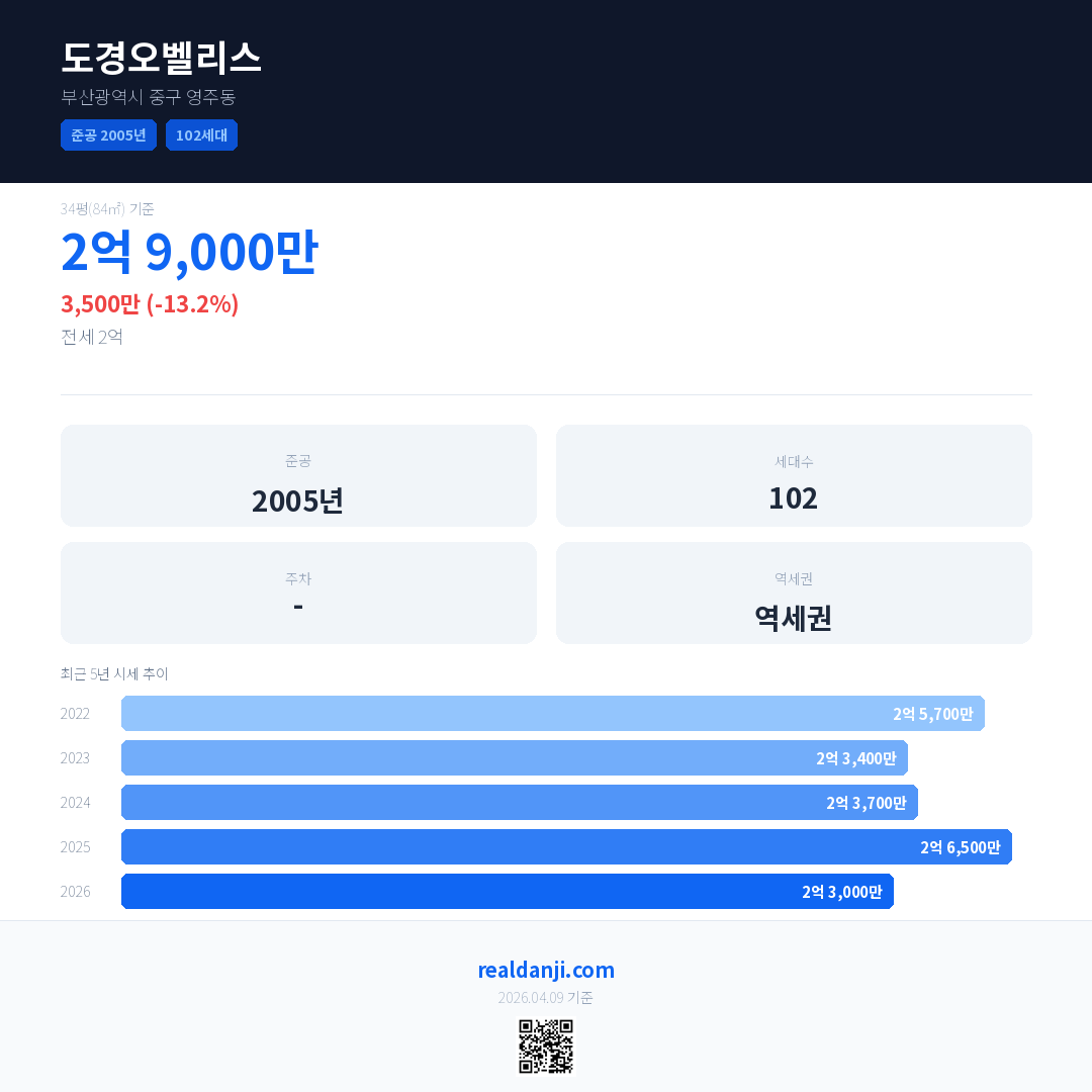 도경오벨리스 국민평형 기준 2026년 평균 거래가는 2억 3,000만으로, 전년 대비 13.2% 하락 했습니다.