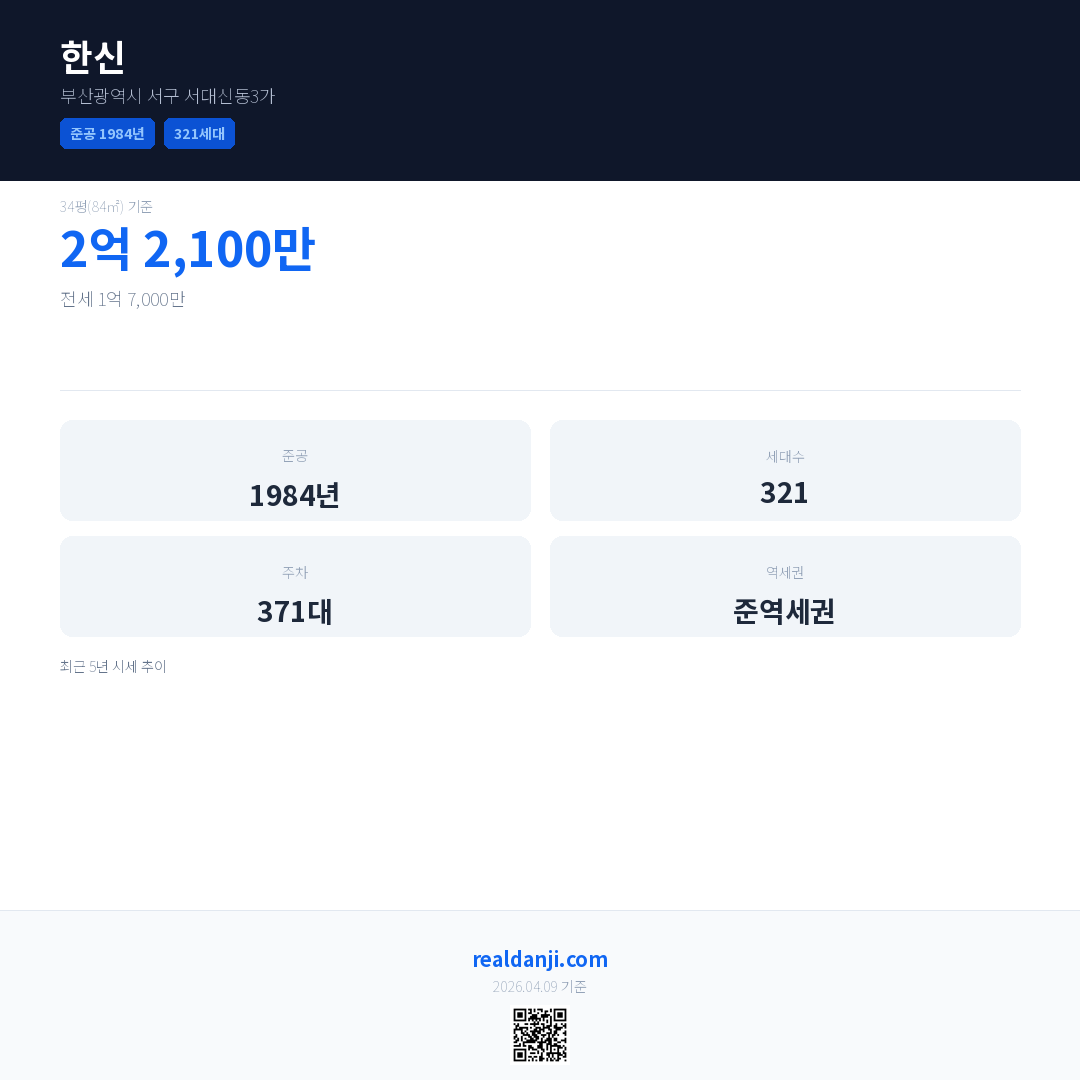 한신은(는) 1984년에 준공되었으며, 현재 42년차입니다. 총 321세대 규모입니다.