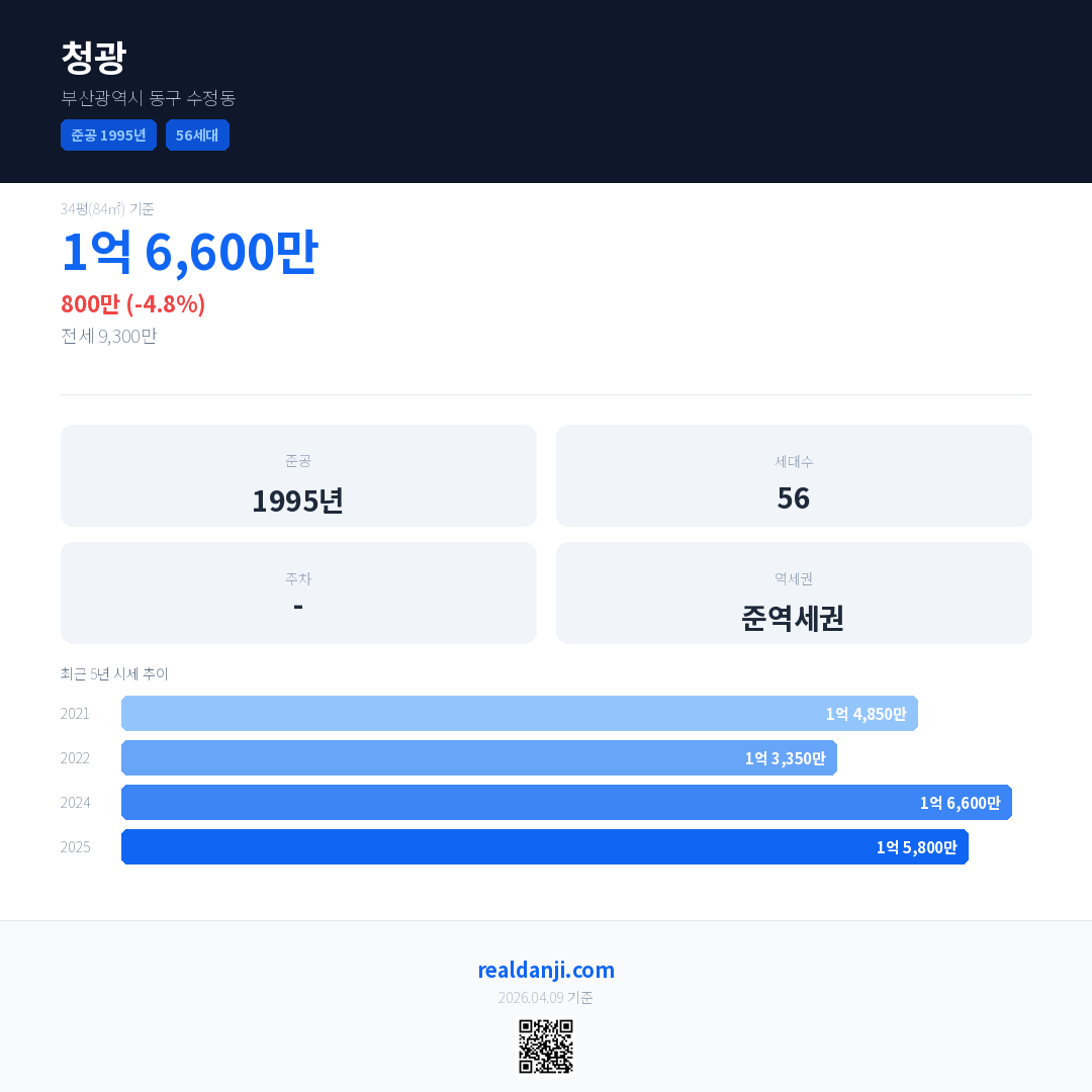 청광 국민평형 기준 2025년 평균 거래가는 1억 5,800만으로, 전년 대비 4.8% 하락 했습니다.