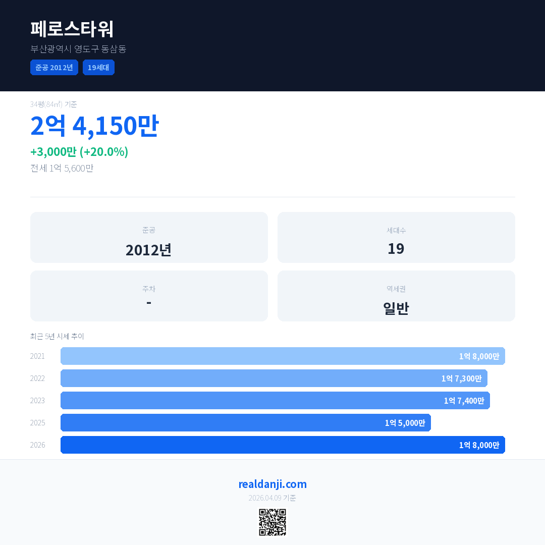 페로스타워 국민평형 기준 2026년 평균 거래가는 1억 8,000만으로, 전년 대비 20.0% 상승 했습니다.