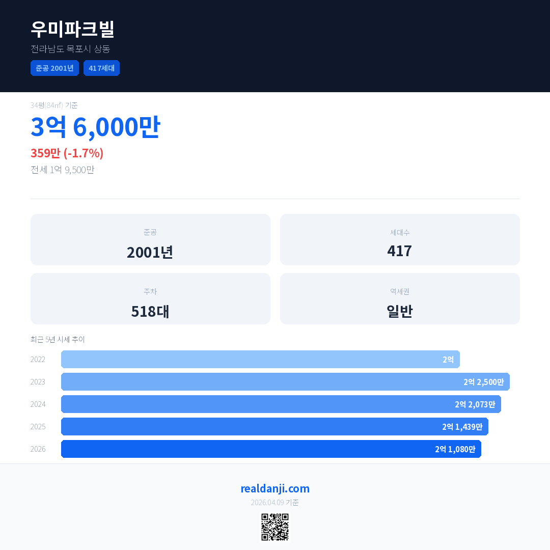 우미파크빌 최근 거래가는 3억 6,000만입니다. (2026-03)