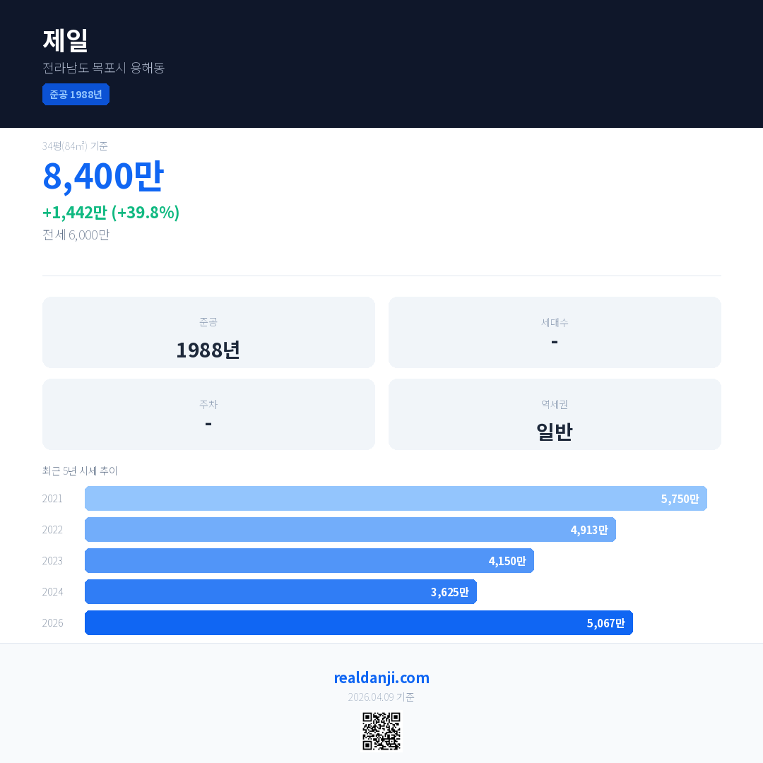 제일 국민평형 기준 2026년 평균 거래가는 5,067만으로, 전년 대비 39.8% 상승 했습니다.
