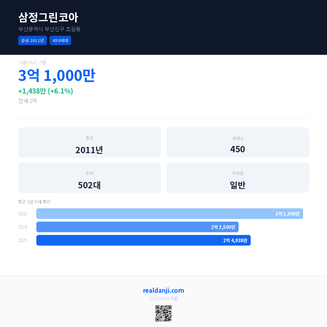 삼정그린코아 국민평형 기준 2025년 평균 거래가는 2억 4,938만으로, 전년 대비 6.1% 상승 했습니다.