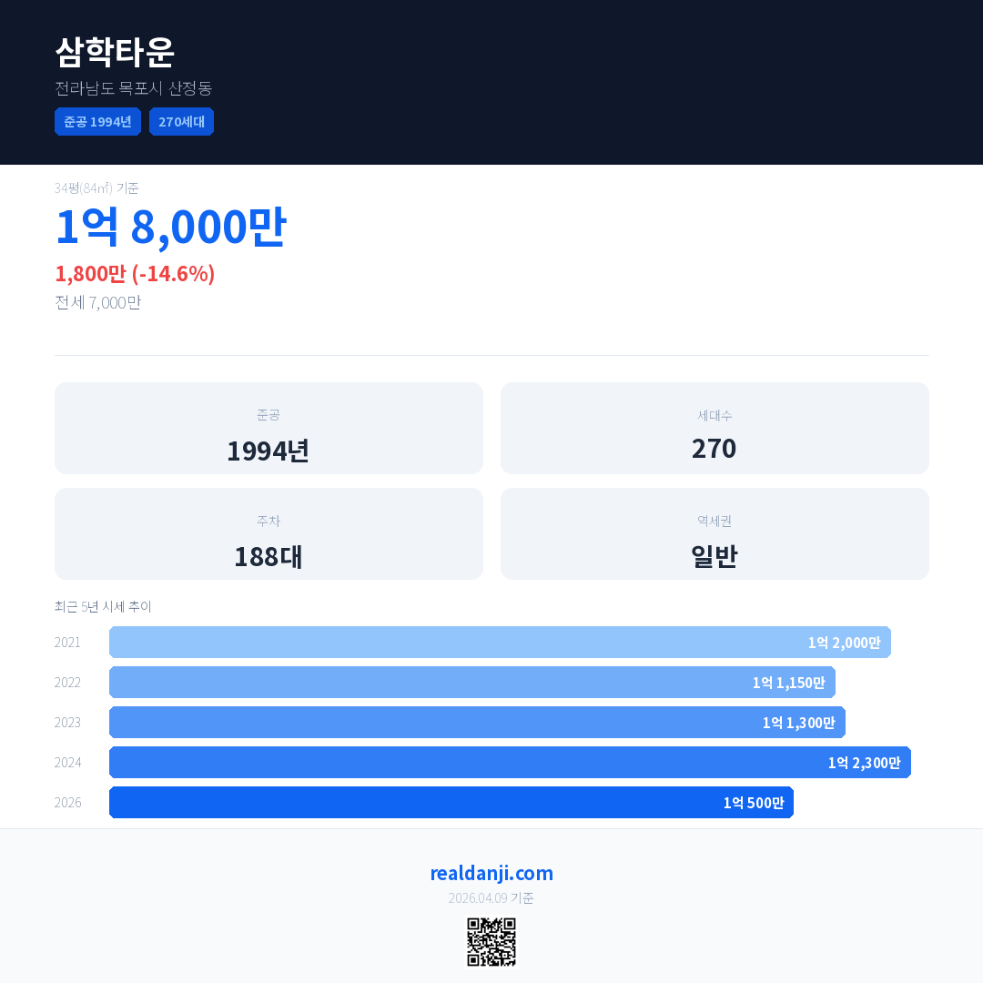 삼학타운 국민평형 기준 2026년 평균 거래가는 1억 500만으로, 전년 대비 14.6% 하락 했습니다.
