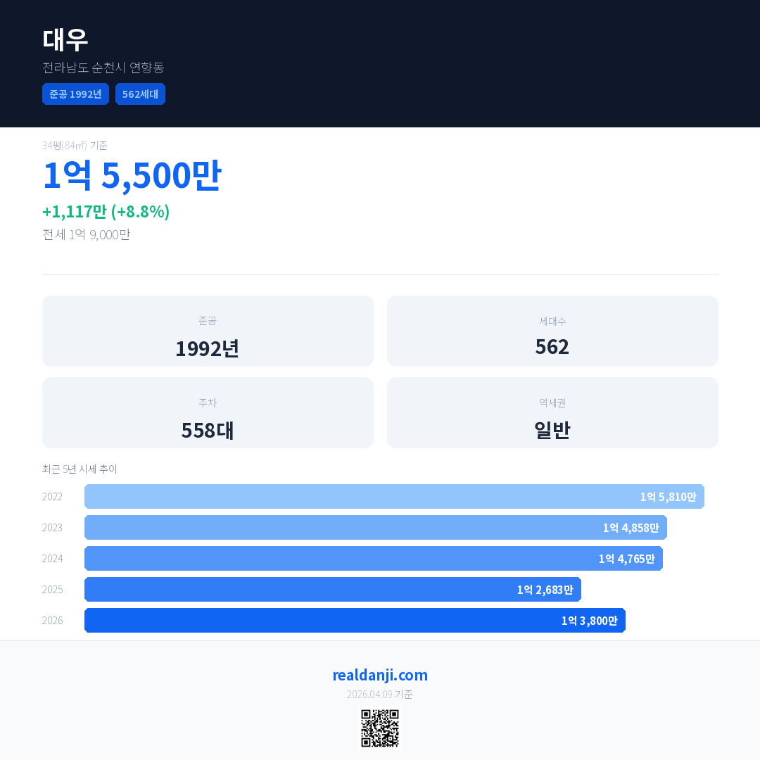 대우 국민평형 기준 2026년 평균 거래가는 1억 3,800만으로, 전년 대비 8.8% 상승 했습니다.