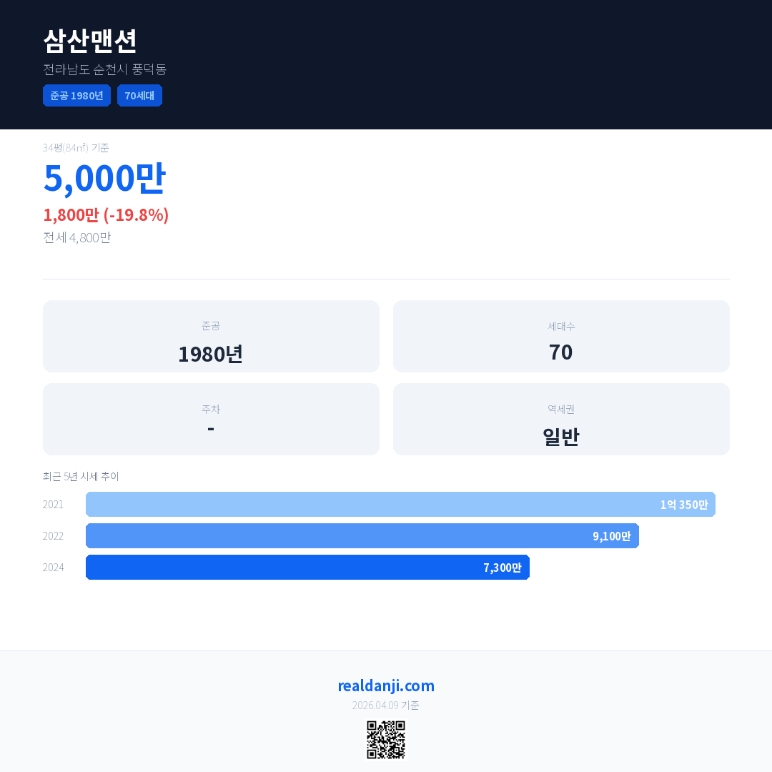 삼산맨션 국민평형 기준 2024년 평균 거래가는 7,300만으로, 전년 대비 19.8% 하락 했습니다.