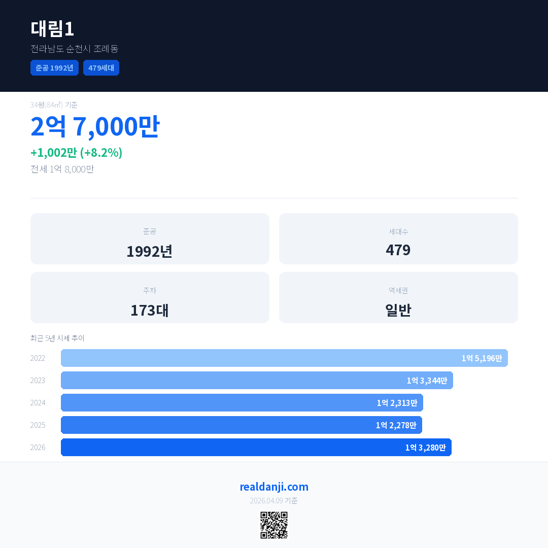 대림1 국민평형 기준 2026년 평균 거래가는 1억 3,280만으로, 전년 대비 8.2% 상승 했습니다.