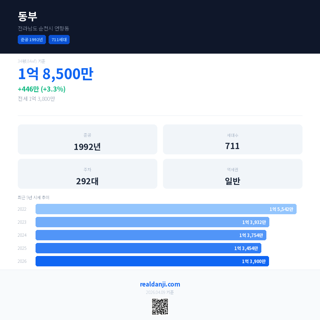 동부 최근 거래가는 1억 8,500만입니다. (2026-04)