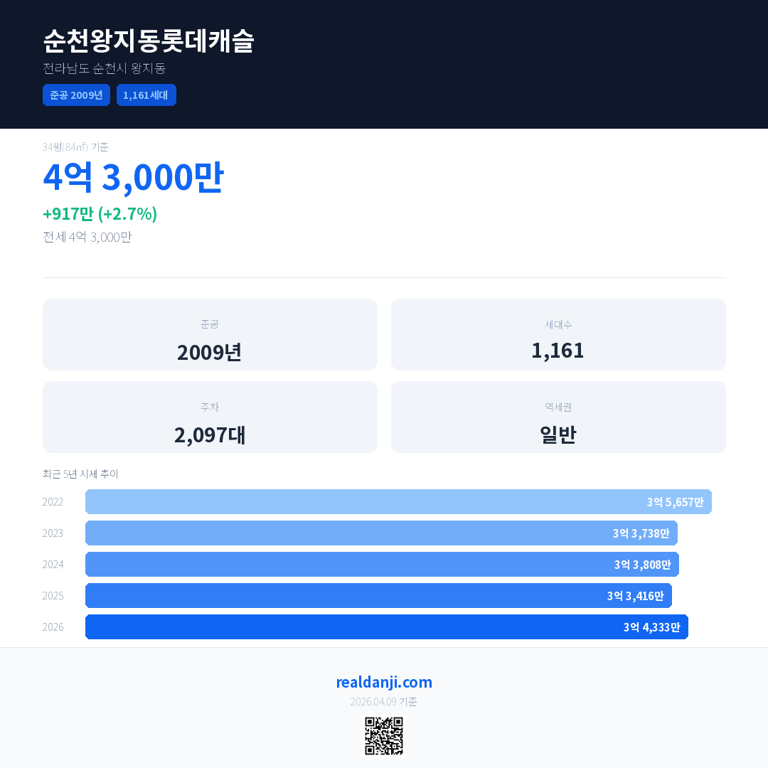순천왕지동롯데캐슬 국민평형 기준 2026년 평균 거래가는 3억 4,333만으로, 전년 대비 2.7% 상승 했습니다.