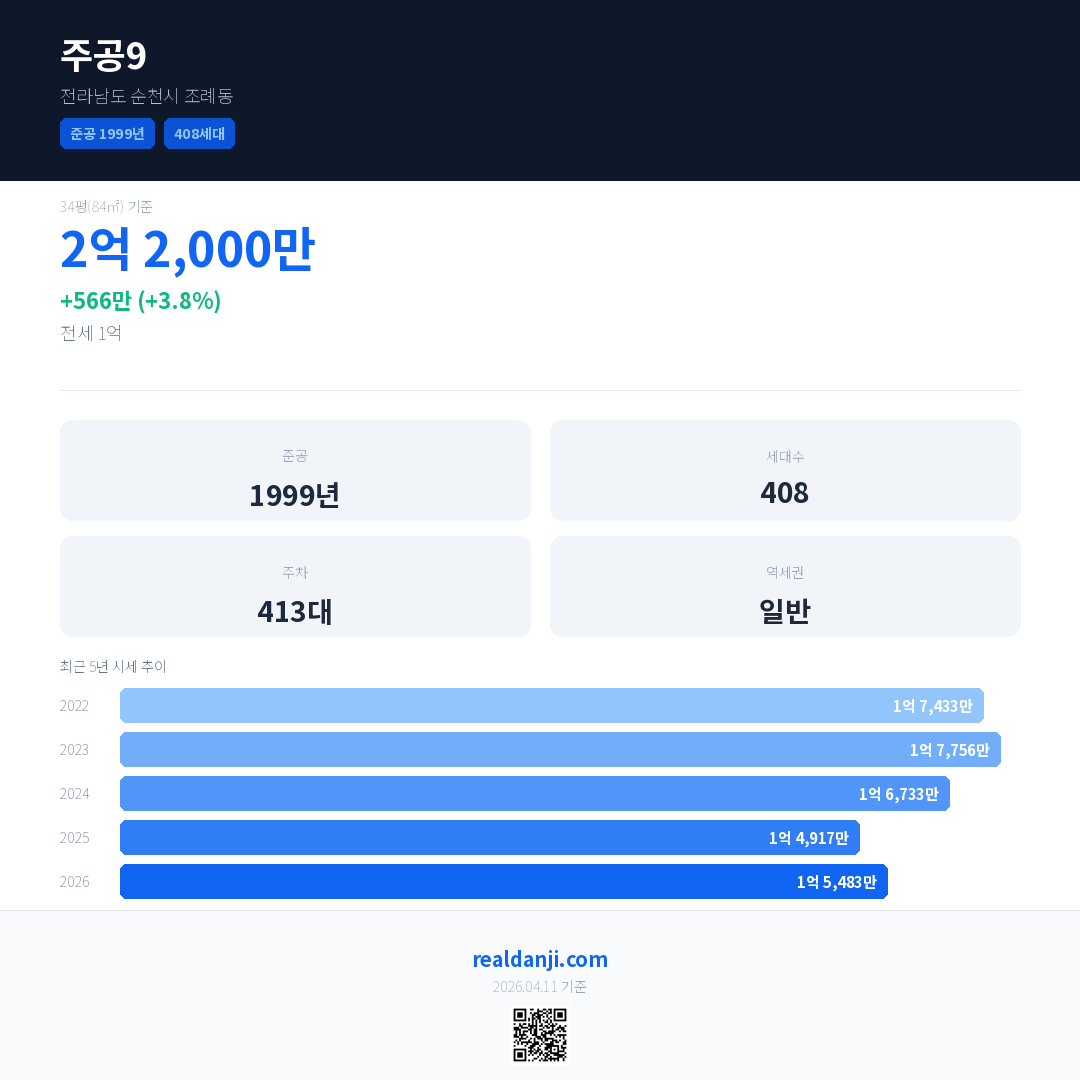 주공9 국민평형 기준 2026년 평균 거래가는 1억 5,483만으로, 전년 대비 3.8% 상승 했습니다.