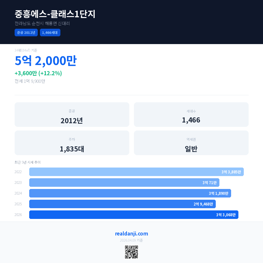 중흥에스-클래스1단지 국민평형 기준 2026년 평균 거래가는 3억 3,068만으로, 전년 대비 12.2% 상승 했습니다.