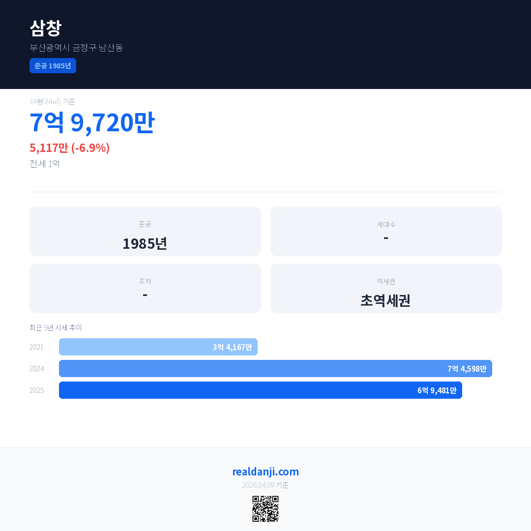 삼창 국민평형 기준 2025년 평균 거래가는 6억 9,481만으로, 전년 대비 6.9% 하락 했습니다.