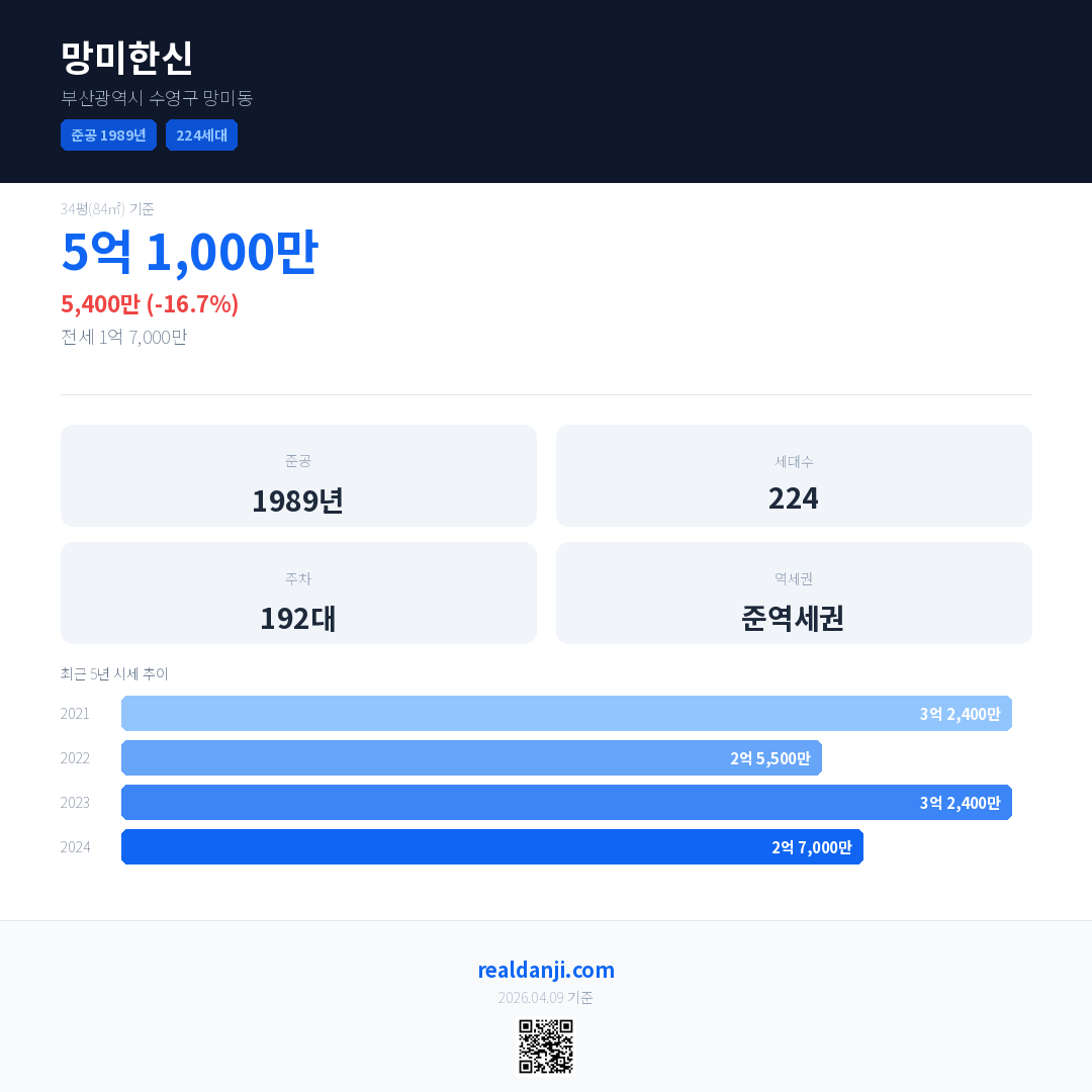 망미한신 최근 거래가는 5억 1,000만입니다. (2024-10)