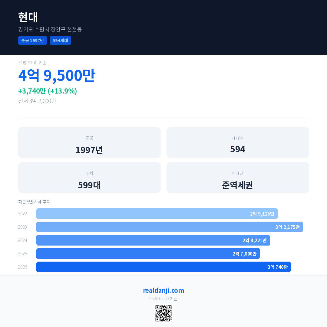 현대 최근 거래가는 4억 9,500만입니다. (2026-03)