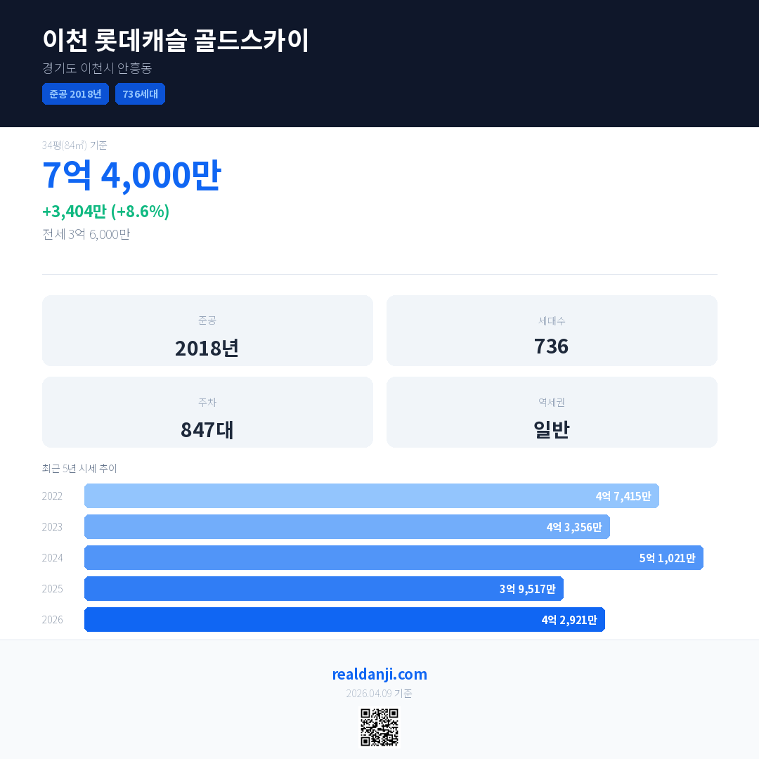 이천 롯데캐슬 골드스카이 국민평형 기준 2026년 평균 거래가는 4억 2,921만으로, 전년 대비 8.6% 상승 했습니다.