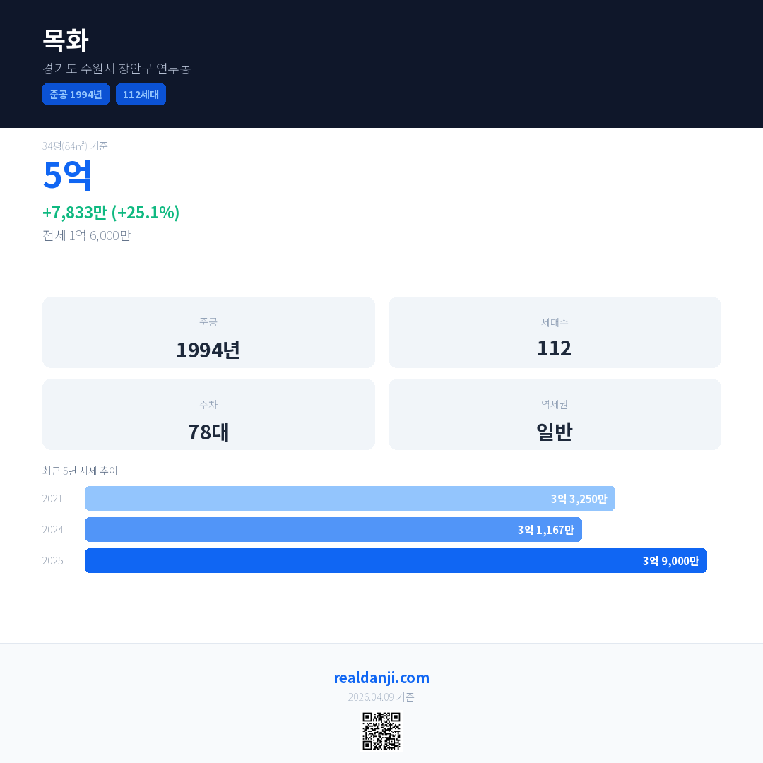 목화 국민평형 기준 2025년 평균 거래가는 3억 9,000만으로, 전년 대비 25.1% 상승 했습니다.