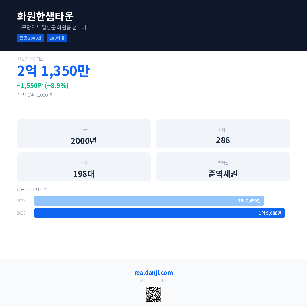 화원한샘타운 최근 거래가는 2억 1,350만입니다. (2025-12)